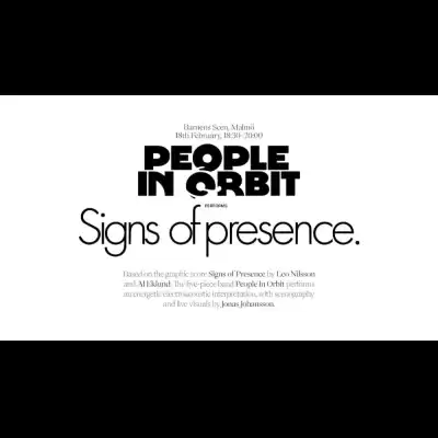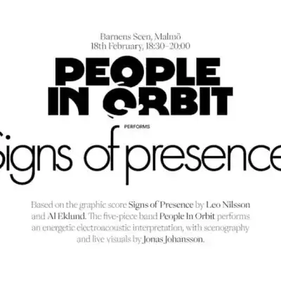 Based on the graphic score Signs of Presence by Leo Nilsson and Al Eklund. The five-piece band People In Orbit performs an energetic electroacoustic interpretation, with scenography and live visuals by Jonas Johansson.