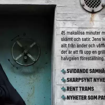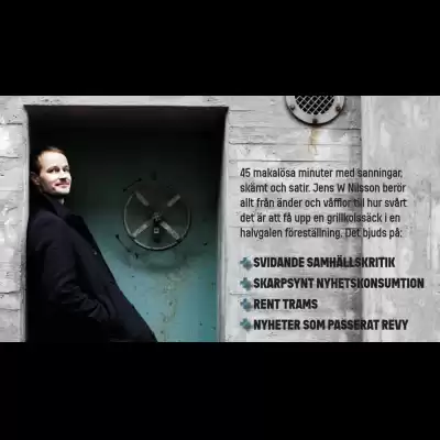 45 maktlösa minuter med sanningar, skämt och satir. Jens W Nilsson berör allt från änder och våfflor till hur svårt det är att få upp e grillkolssäck i en halvgalen föreställning.